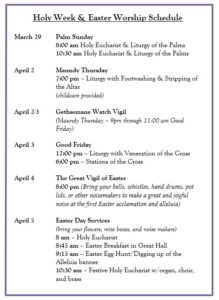 8:00 AM – Holy Eucharist Rite I (Chapel) 9:15 AM – Christian Formation for all Ages 10:30 AM – Holy Eucharist Rite II (Nave) with livestream